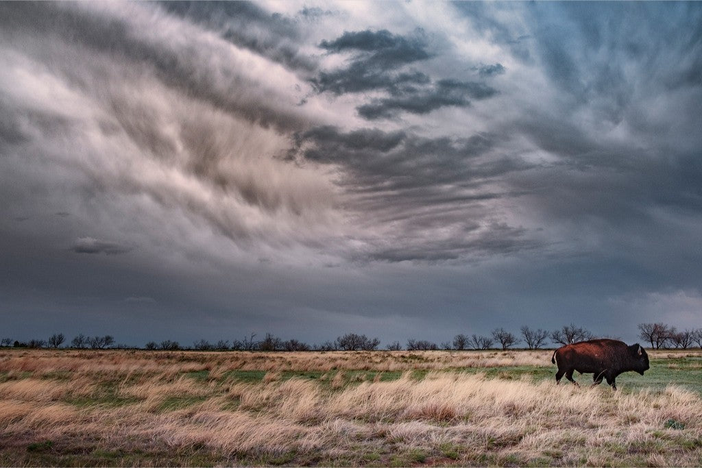 A majestic bison roams freely in Caprock Canyon State Park in West Texas, surrounded by mesquite trees under a dramatic sky at sunset.