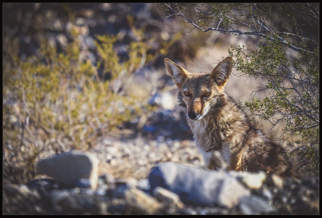 This piece features a coyote peacefully resting under sparse shade in Death Valley.