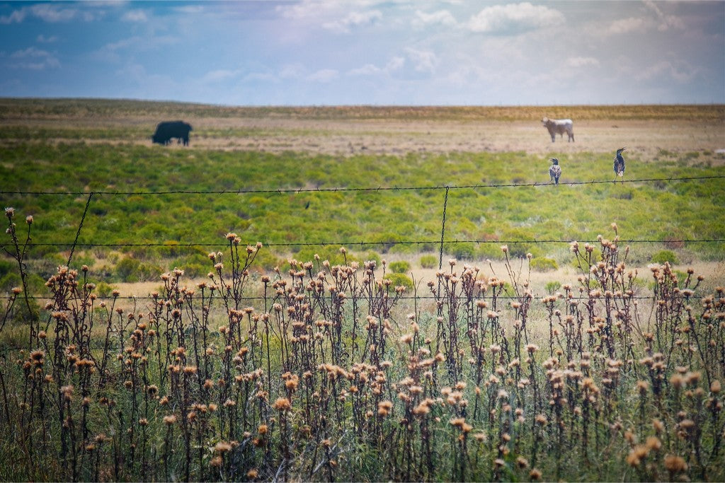 Two sparrows sit on a barbed wire fence as two cows graze in the distance in a field in West Texas.