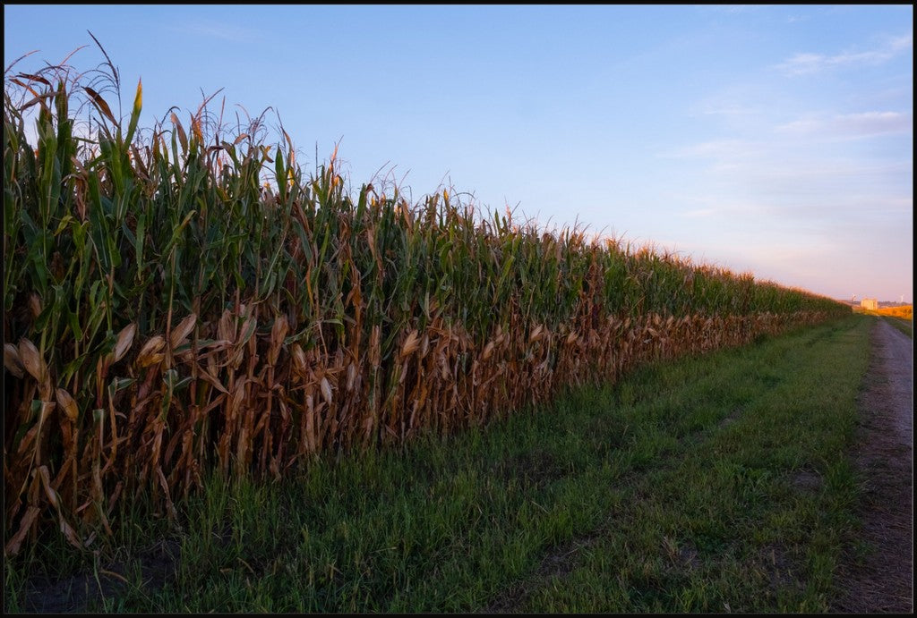 Tall corn nearly ready for harvest stands reaching up to a blue sky with clouds in Northwest Missouri.
