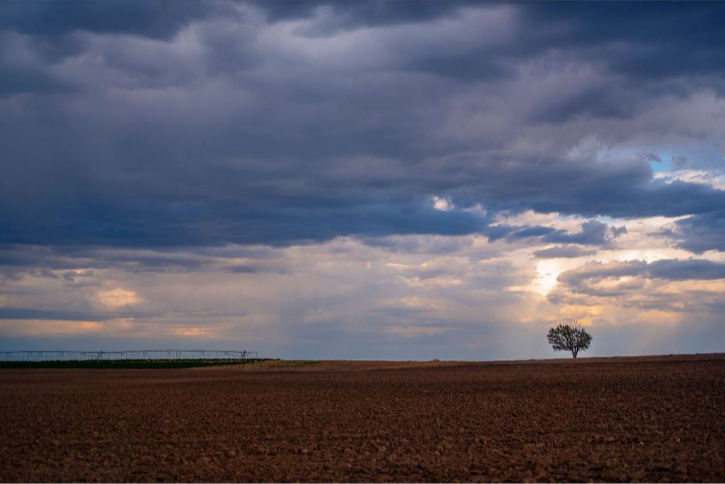 This photo features a solitary mesquite tree in a plowed field under a moody West Texas sky.