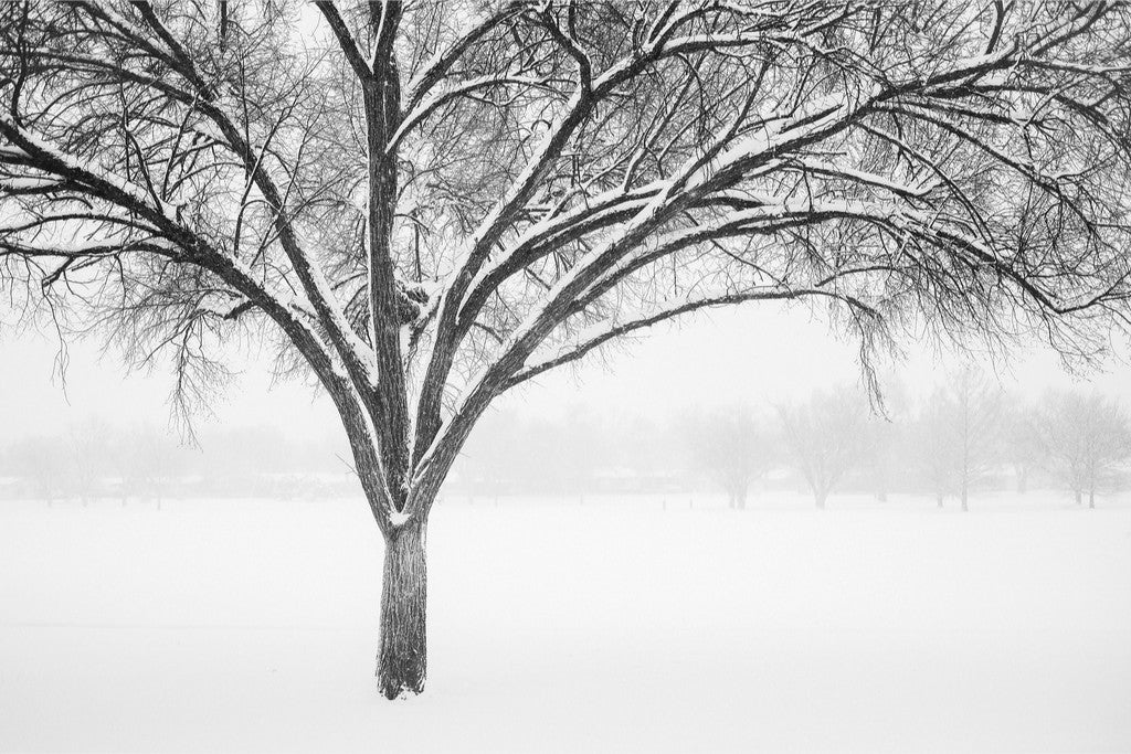 A snow-covered tree stands at the front of a fog and snow covered Tech Terrace Park in Lubbock, Texas, after a winter storm.