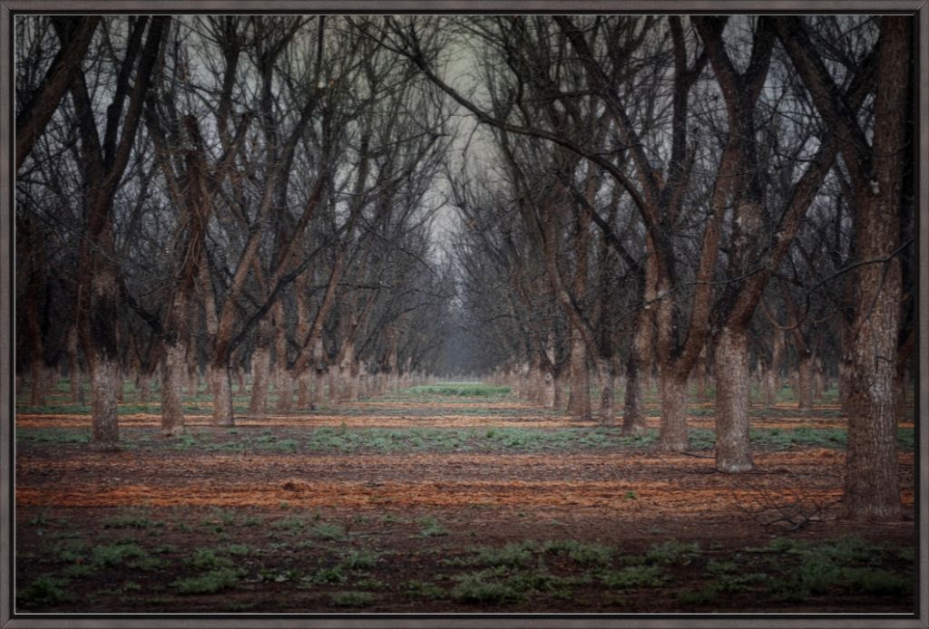Experience the beauty of a pecan grove near Las Cruces, New Mexico, rows of still-dormant trees stretching out into the distance.