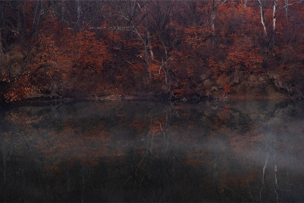 Experience the beauty of a foggy winter lake in a Northwest Missouri woodland. Golden-brown leaves still hang from the trees around the lake, reflecting their color on the still water.