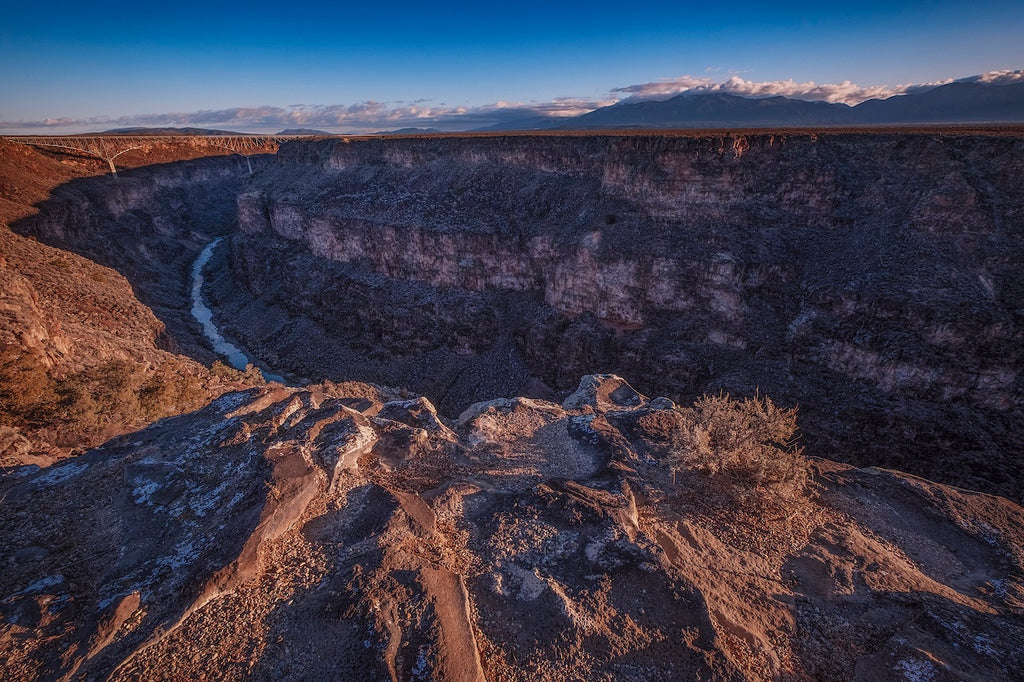 The Sangre de Cristo Mountains stand just beyond the Rio Grande Gorge and bridge outside of Taos, New Mexico.