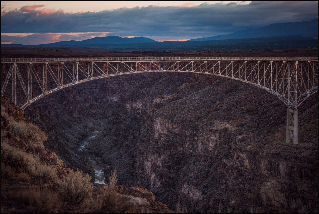The Sangre de Cristo Mountains stand just beyond the Rio Grande Gorge and bridge outside of Taos, New Mexico.