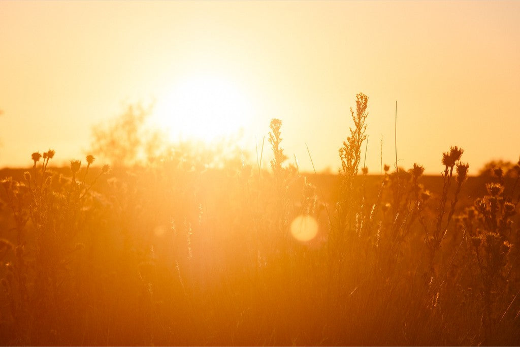 This photo features a bright West Texas sunset over a field of prairie grass.