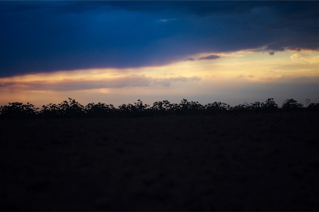 A silhouetted cotton field is contrasted against a West Texas sunset in this charming photograph.
