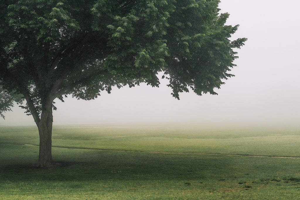 Early spring fog fills Tech Terrace park beyond a tree and lush green grass in the foreground.
