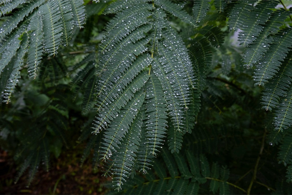 This piece features a Persian Silk plant adorned with glistening raindrops, creating a serene and tranquil atmosphere.